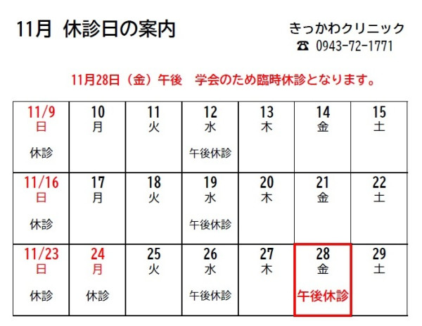 11月休診案内(11/28PM臨時休診)